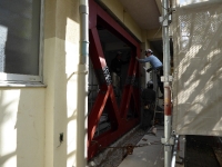 10月1日にクレーン車で耐震用の鉄骨の枠のはめ込み作業が行われ、一階の教室の外側3カ所に鉄骨の枠が組み込まれました。