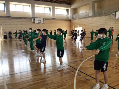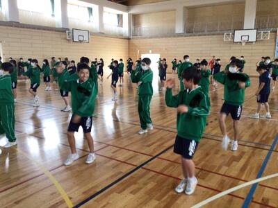2024年11月1日 14時03分5校時に体育館で1年生を対象に「わらじ踊り講習」を行いました。講師は、福島市商工会議所のみなさんです。