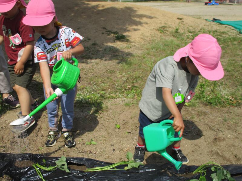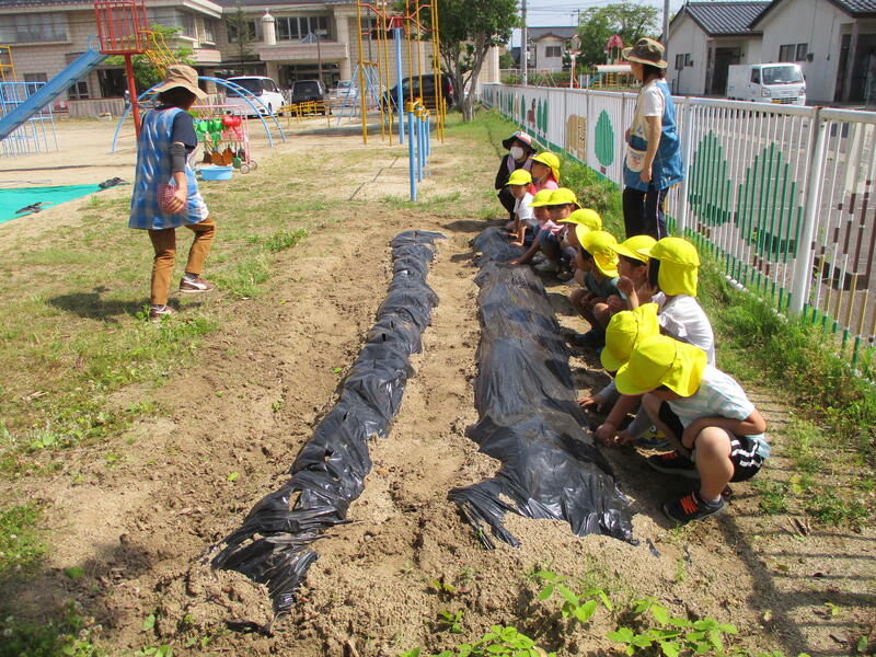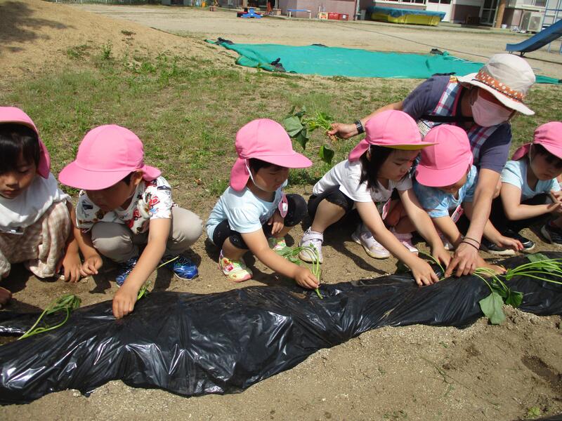 園庭の畑に、サツマイモの苗を植えました。