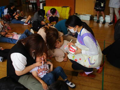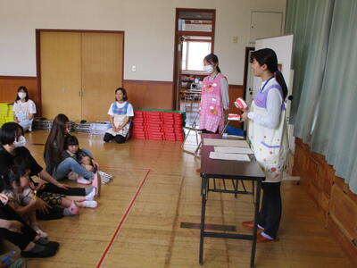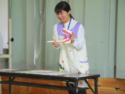保育参観後のPTA教養講座では、福島保健所の保健師と歯科衛生士の方々を講師に「親子歯みがき教室」を行いました。親子で、仕上げ歯みがきを実際に行い、アドバイスもいただきました。
