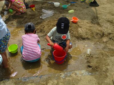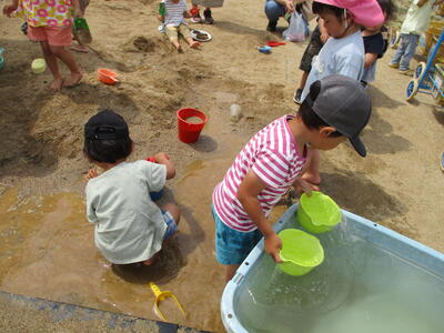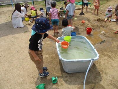 天気が良く、シャボン玉をしたり、砂遊びをしたりして一緒に遊びました。