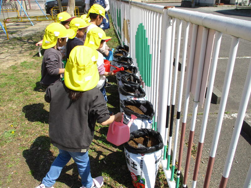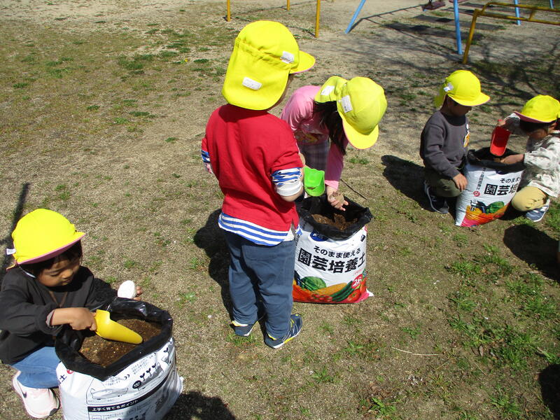 年長ほし組の子どもたちが、ジャガイモを植えました。