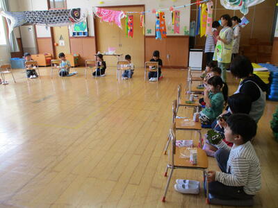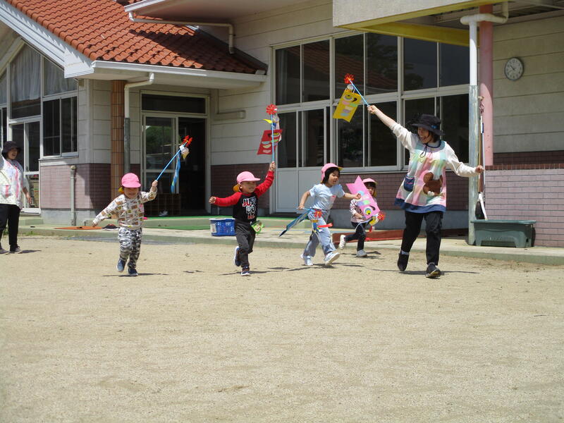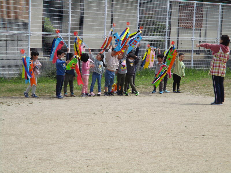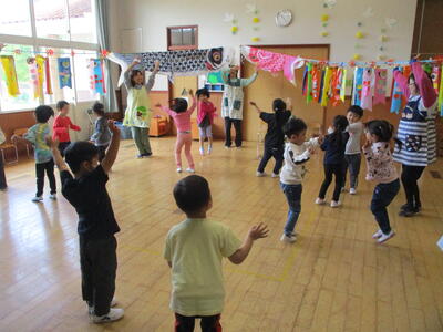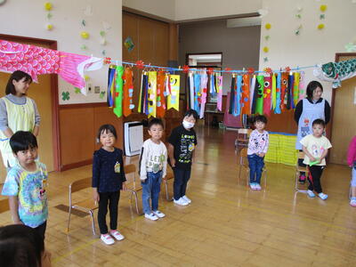 一人一人が作ったこいのぼりを飾り、こいのぼりパーティーで楽しく過ごしました。