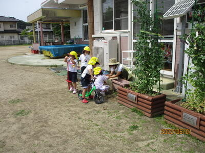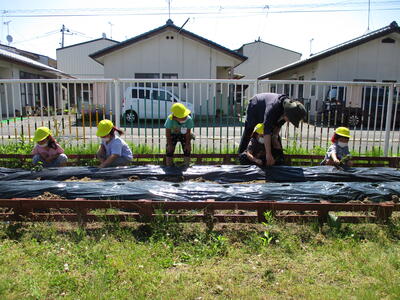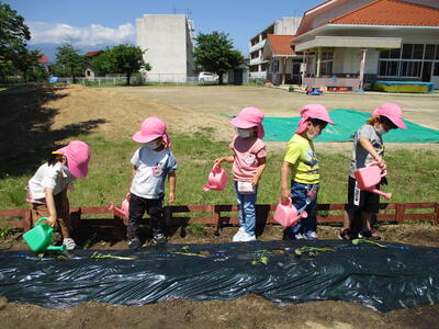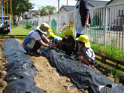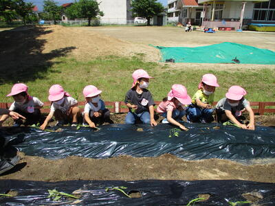 気温が高くなる予報だったので、年長組と年少組に分かれて、朝いちばんに植えました。