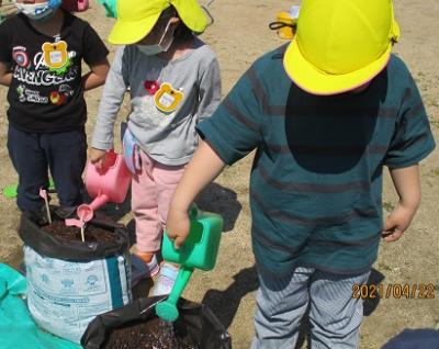 「おなかがすかないように、サツマイモさんにお水を飲ませてあげよう」