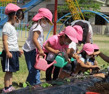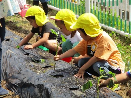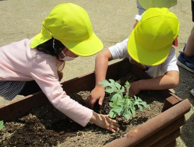 年長ほし組さんは、いろんな野菜を植えて育てています。水をあげたり、芽かきをしたり、除草したりして大事に育てています。