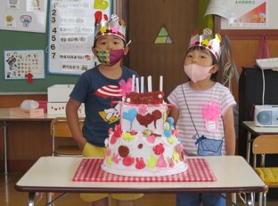 誕生会では、できたてのケーキを使って2人のお友達の誕生会をしました。