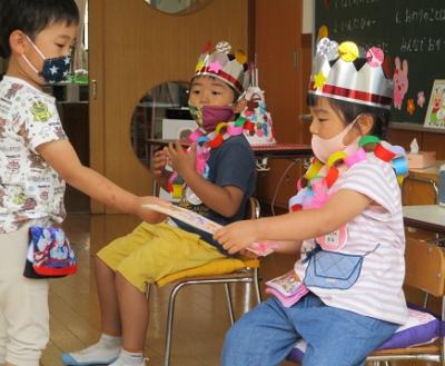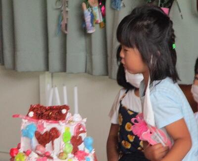 はじめに、誕生会をしました。ケーキのろうそく消しやプレゼントをし、お祝いしました。
