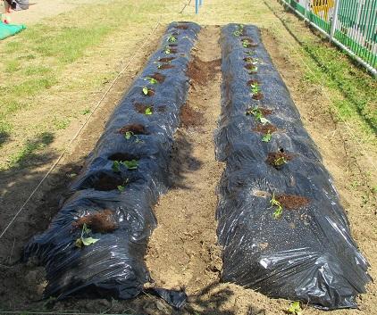 左側の畝が、年少もも組さん。右側の畝が、年長ほし組さん。