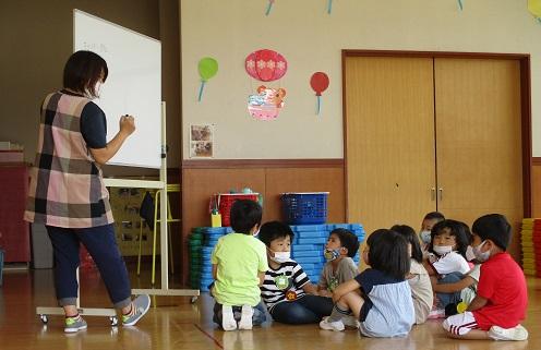 きらきら笑顔で楽しそうな年少もも組さん。それを見てうれしい笑顔の頼もしい年長ほし組さん。