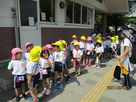 年長ほし組さんが年少もも組さんと手をつなぎ、交通安全に注意しながら歩いて行きました。