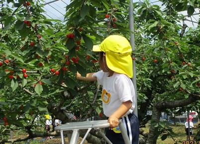 いろんなサクランボが実っていて、どれを食べようか迷ってしまいます。5名の保護者の方がお手伝いをしてくださり、高い所のサクランボも安全に採ることができました。