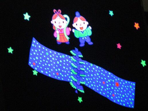 次に、七夕集会をしました。七夕のお話をブラックシアターで楽しみました。