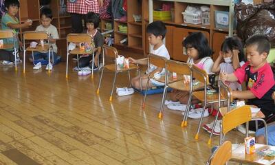 <お水タイム> 遊びの合間に水分を補給して、熱中症予防です