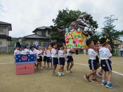 はじめに、園庭でみこしをかつぎました。年長ほし組さん手作りの「恐竜みこし」です。