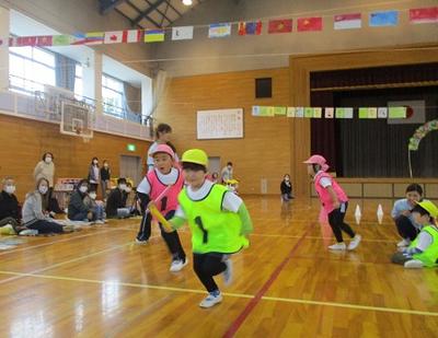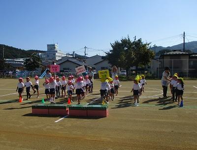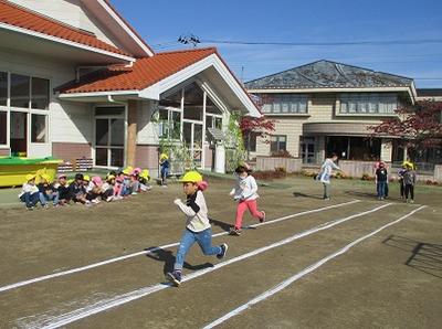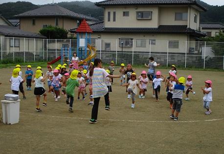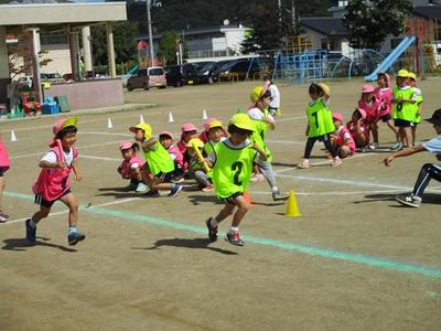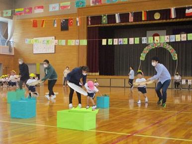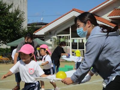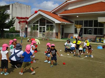年少もも組は「対抗玉入れ」で勝負 年長ほし組は、広い園庭で「対抗リレー」で勝負