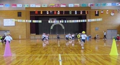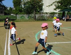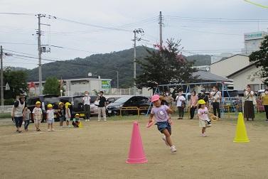 年少もも組はコーンを回ってタッチ! 年長ほし組はトラックを一周してタッチ!