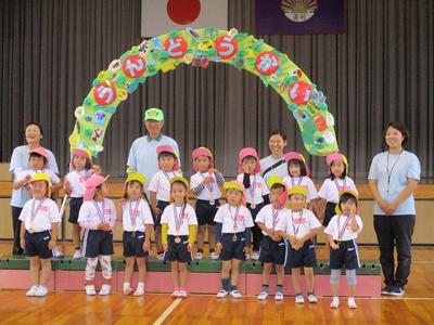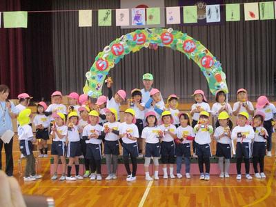 9月1日、 以前から実施していた年長ほし組のチャレンジタイムに、今日から年少もも組が加わり、園児全員で「エビカニクス」を踊りました。