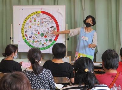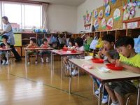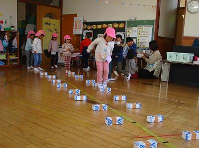 年少もも組が、コーンを回って対抗リレー 食物の栄養について分類表で確認