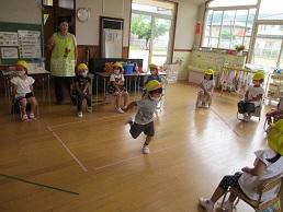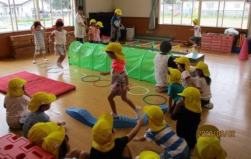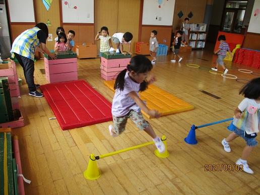 9月3日 今日は年少もも組がサーキット遊びをしました。巧技台ジャンプ、連続ジャンプ、トンネルくぐり・・と挑戦しました。始めはおっかなびっくりだった子どももだんだん上手にできるようになりました。