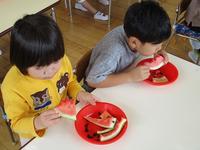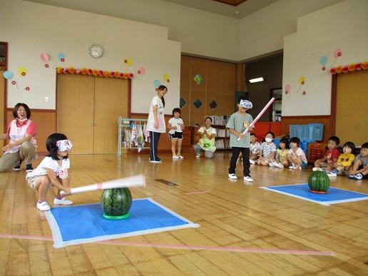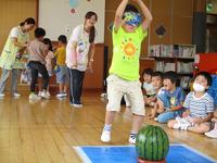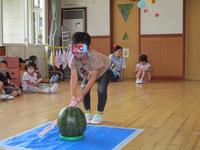 目かくしして友だちの声をたよりに大きなLLサイズのスイカにむかいました。その後、みんなでスイカをいっぱい食べました。とってもおいしくてとっても楽しい夏の思い出の一コマです。