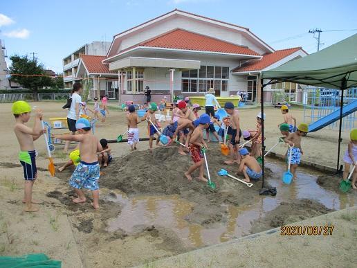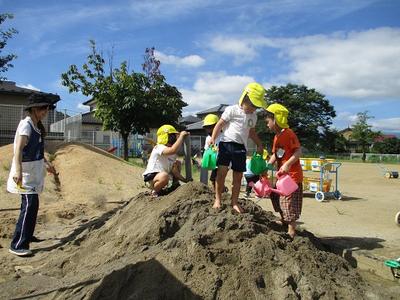 8月25日 砂場に新しくきれいな砂が入りました。はだしで踏むと「気持ちいい!」