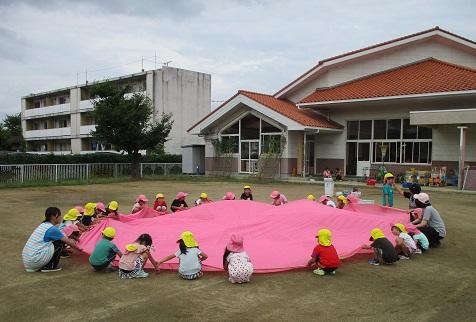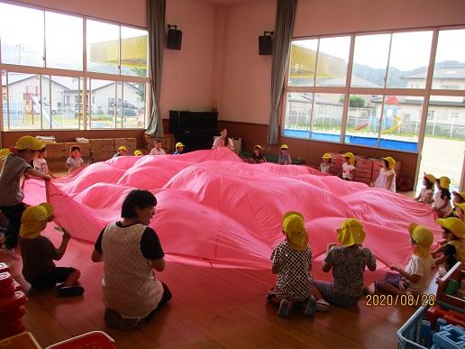 8月28日 年長ほし組がバルーンで遊びました。大波・小波が「気持ちいい!」