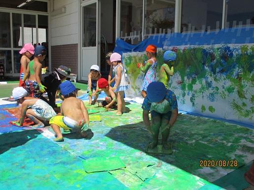 8月28日 年少もも組が塗りたくり遊びをしました。体中が絵の具だらけ、そして大きなキャンバスに体当たり・・・「気持ちいい!」