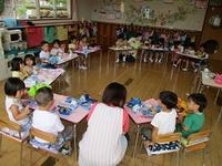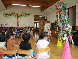 今日は7月7日、七夕です。本園では、7月生まれの園児3名の誕生会と七夕の集いを合わせて行いました。
