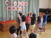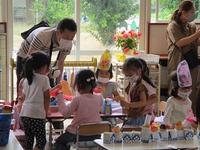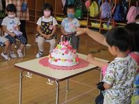 6月生まれの4人のお友だちの誕生会をしました。いつもならばほし組・もも組が一緒に全員でお祝いをするのですが、密集を避け学級ごとに実施しました。インタビュー,プレゼント,歌にダンス,ジュースにおかし・・・。みんな笑顔の楽しい楽しい誕生会でした。