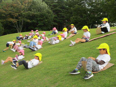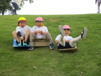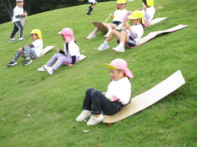 また、段ボールで作った手作りそりで草の上を滑りました。