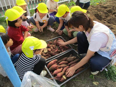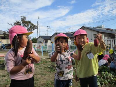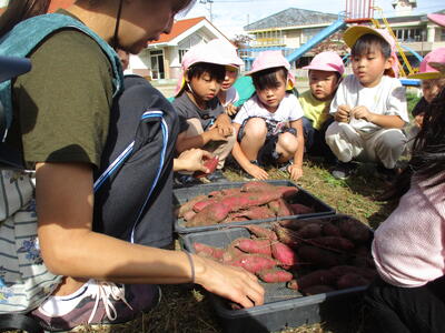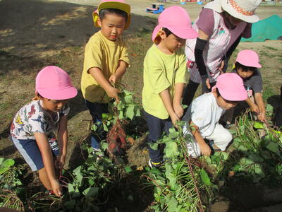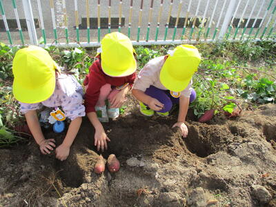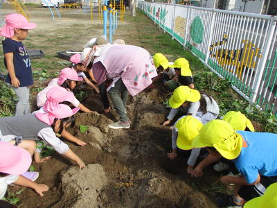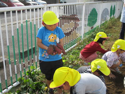 土の中から、大きなサツマイモがたくさん出てきて、子どもたちは、歓声をあげながら収穫しました。