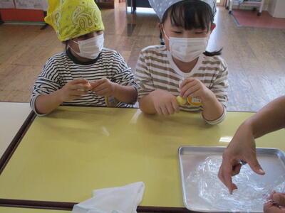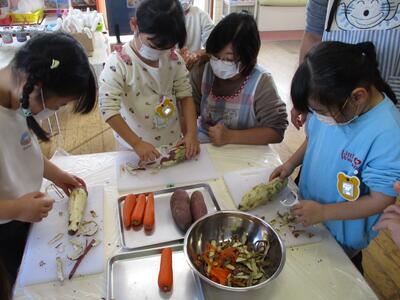 野菜は、年長ほし組の子どもたちが、皮むきを手伝いました。