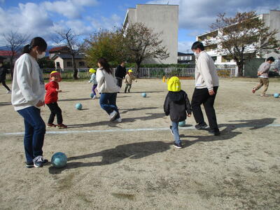 「なべちゃんコーチ」こと渡邊剛充さんを講師に、親子で、サッカーはもちろん、様々な運動に取り組みました。