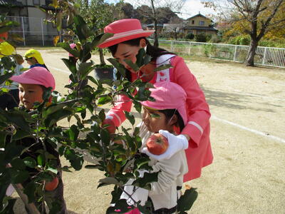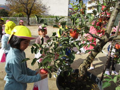 渡利幼稚園で、鉢植えリンゴ狩りを行いました。