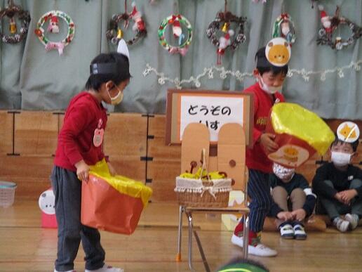 〇 年少もも組さんが、劇「どうぞのいす」を発表しました。