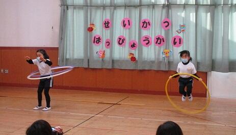 <換気が終わり、次に「特技発表」です。フラフープ・ボール等に挑戦しました。>