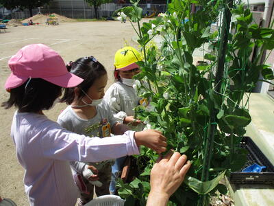 スナップエンドウ おいしい 2022年5月10日 13時42分 園で育てていた「スナップエンドウ」を年長のほし組の当番の友だちが収穫しました。 お弁当の時間に食べました。とてもおいしそうです。 これから、当番を決めて何度か収穫します。