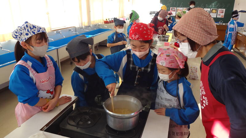 3年生はこの日に備え、冬休み中にピーラーの使い方を練習してきたようです。上手に皮をむき、包丁で薄く切って煮詰めていきます。講師の先生方に丁寧に教えていただきながら、班ごとに味を微調整して仕上げました。