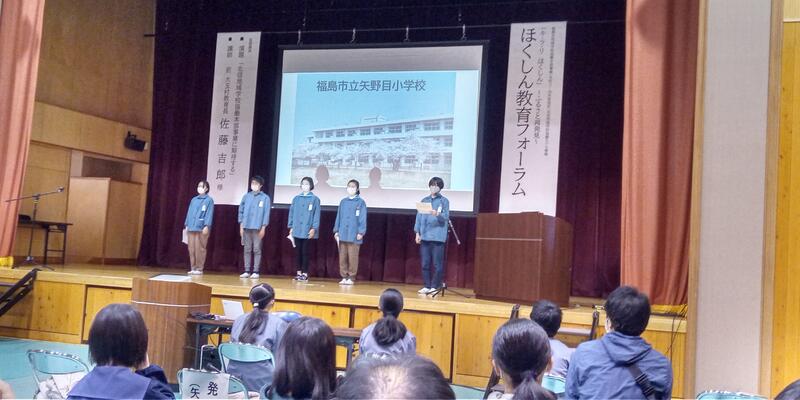 本校からは6年生の代表児童が参加し、1年生から6年生までの今年度の取り組みについて発表しました。「地域の人・もの・こと」をテーマとして、それぞれの学年の実践や感想を、たくさんの写真とともに堂々と紹介する姿はとても頼もしく見えました。事情があって参加できなかった子たちの思いも含め、大変立派でした。