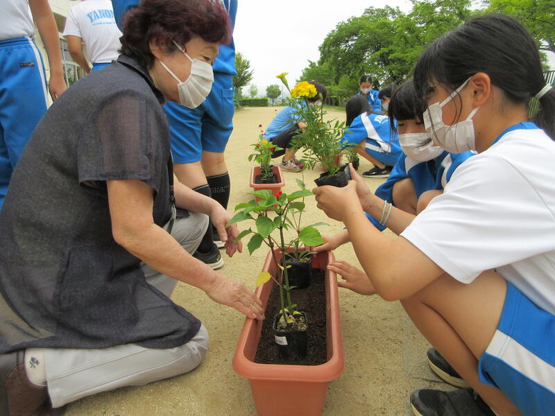 花苗の贈呈式ののち、環境委員会の子どもたちと人権擁護委員の皆様が、お互いに協力し合ってプランターに苗を移植しました。