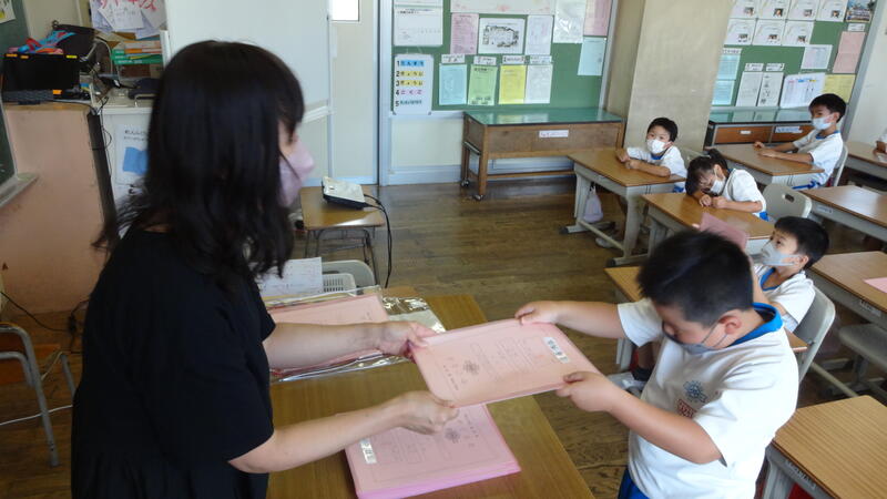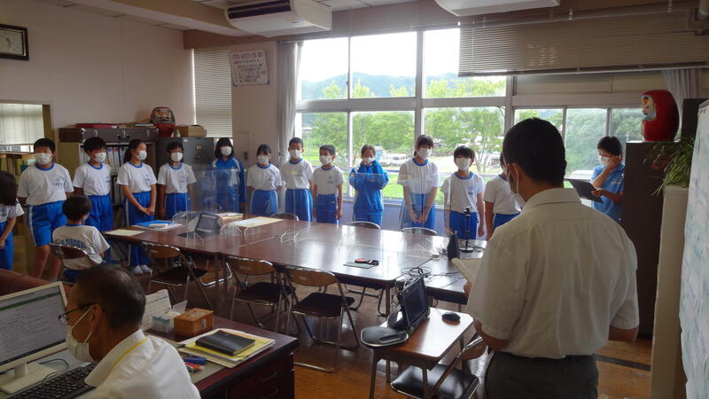 オンライン形式で行った終業式では、校長先生がそれぞれの学年の頑張った姿をスライドを使って紹介し、今後のさらなる活躍に期待しますとのお話がありました。また、2・4・6年生の代表者3名が、1学期の振り返りと夏休みの計画・めあての発表も行いました。