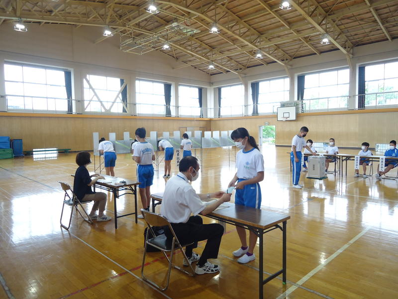 投票用紙や記載所,投票箱等を搬入し,実際に行われる投票所を再現していただきました。講話に続いて模擬投票の実習です。子供達は緊張した面持ちで,記載や投票等、貴重な経験を得ることができました。ご準備くださいました講師の先生方ありがとうございました。