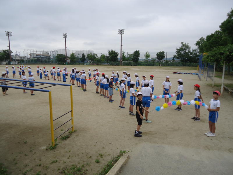 6年生の代表児童と計画を重ね,7月21日(火)に,「1年生とのなかよし交流会」を実践することができました。今回は,校庭で,1年生と6年生での実施といたしました。