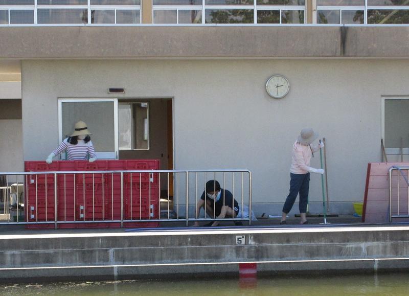 今回は、プールサイドや更衣室等の整備を中心に行いました。徐々にプール内部の清掃や機械による濾過等を進める