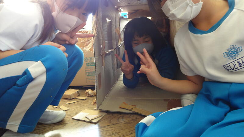 この日のために用意したたくさんの段ボールを使って、基地や乗り物など、思い思いの作品作りに取り組みました。どのクラスの子も笑顔がいっぱいで、心から楽しんでいる様子がうかがえました。
