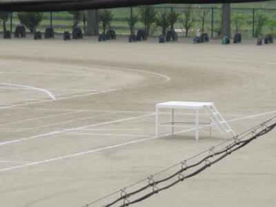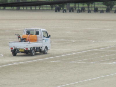 ※砂ぼこりが立たないよう、子どもたちが走りやすいようにと散水中!