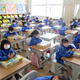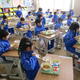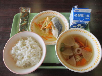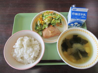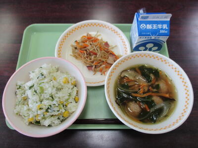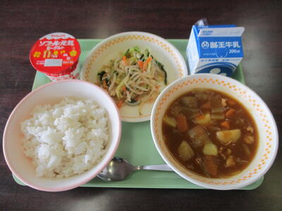 1年生が給食デビューしました。メニューは、一番人気のチキンカレー!どのクラスもしっかりと「黙食」ができていました。