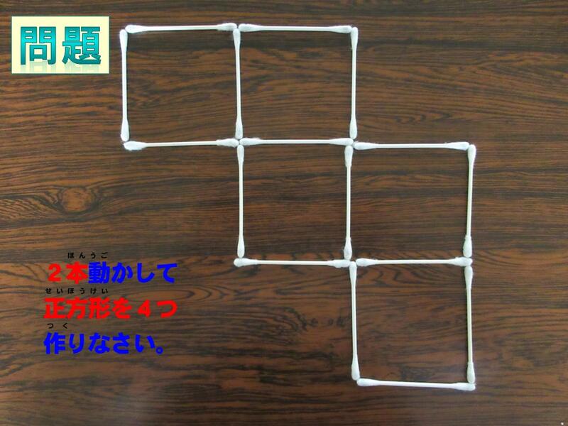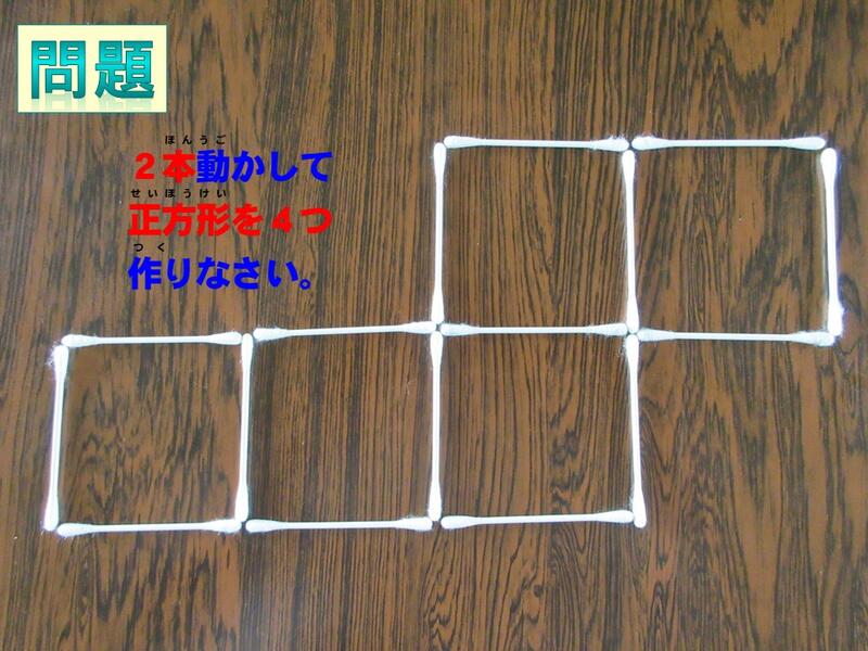 問題「2本動かして、正方形を4つ作りなさい」※綿棒を使って試してみましょう。動かした2本は、どこかに使わなければなりません。