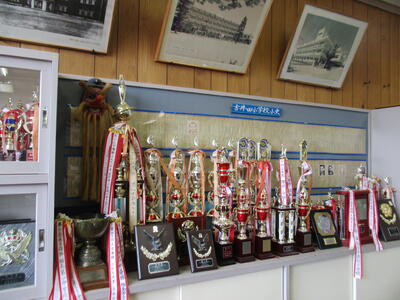 今日は、1年生の学校探検の日。校長室にもかわいらしいお客様が来ました。たくさんの「トロフィーや楯」「航空写真」に興味津々の様子でした。上手に探検ができたご褒美に「手品」のプレゼントを。